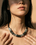 Electroformed beads with a porous, cratered surface— alternating super black and satin silver—strung on a soft silk cord. The texture reads like cooled lava, catching light in small, quiet highlights.