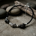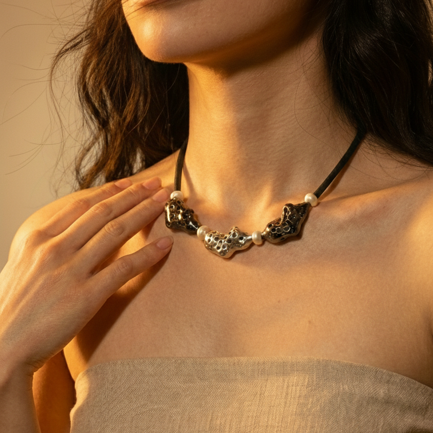A sculptural trio of electroformed beads two in deep super black, one in satin silver punctuated with fresh water pearls on a soft silk cord. Textured surfaces catch light quietly, balanced between depth and glow.